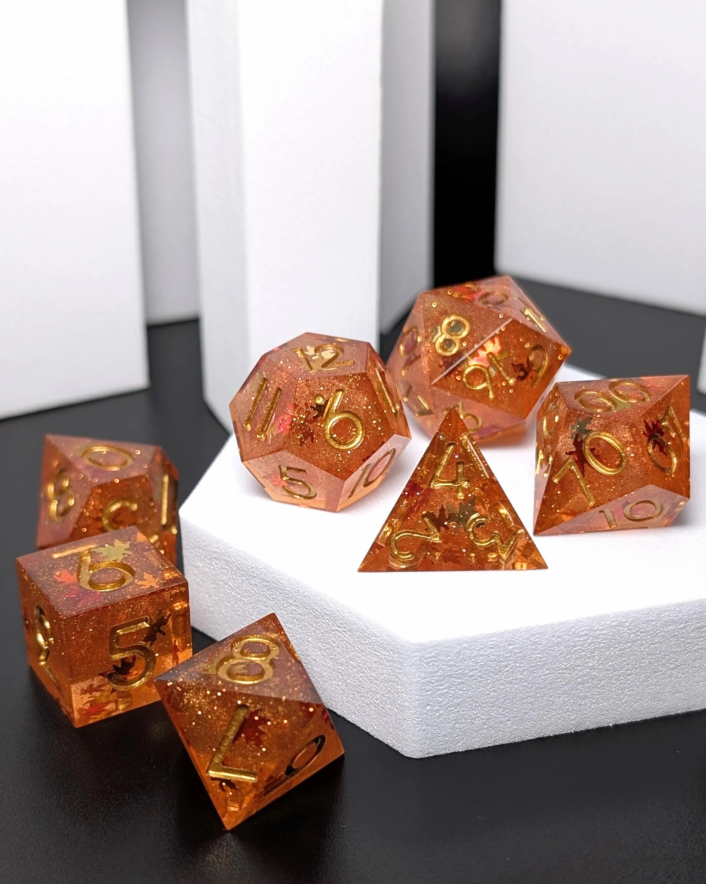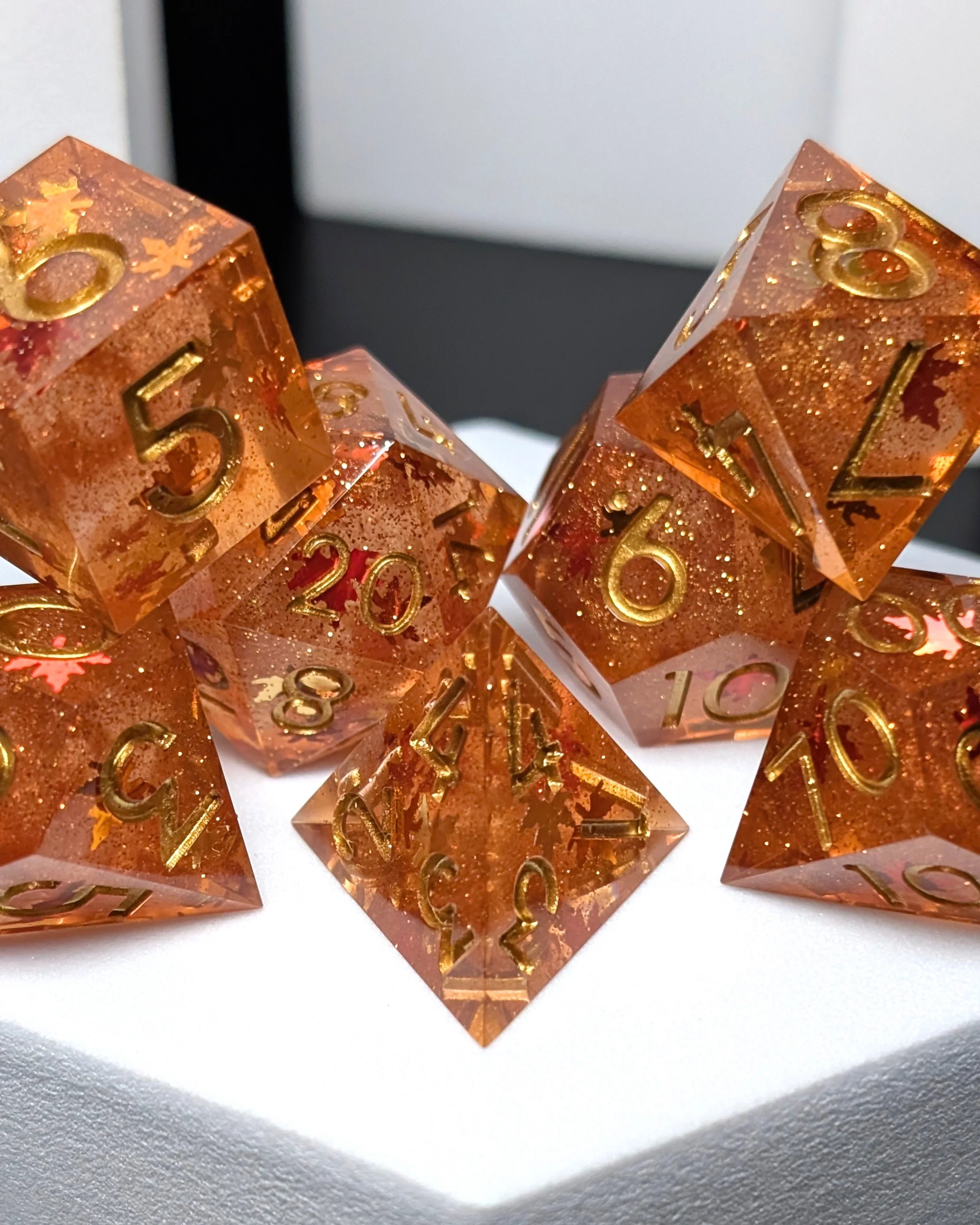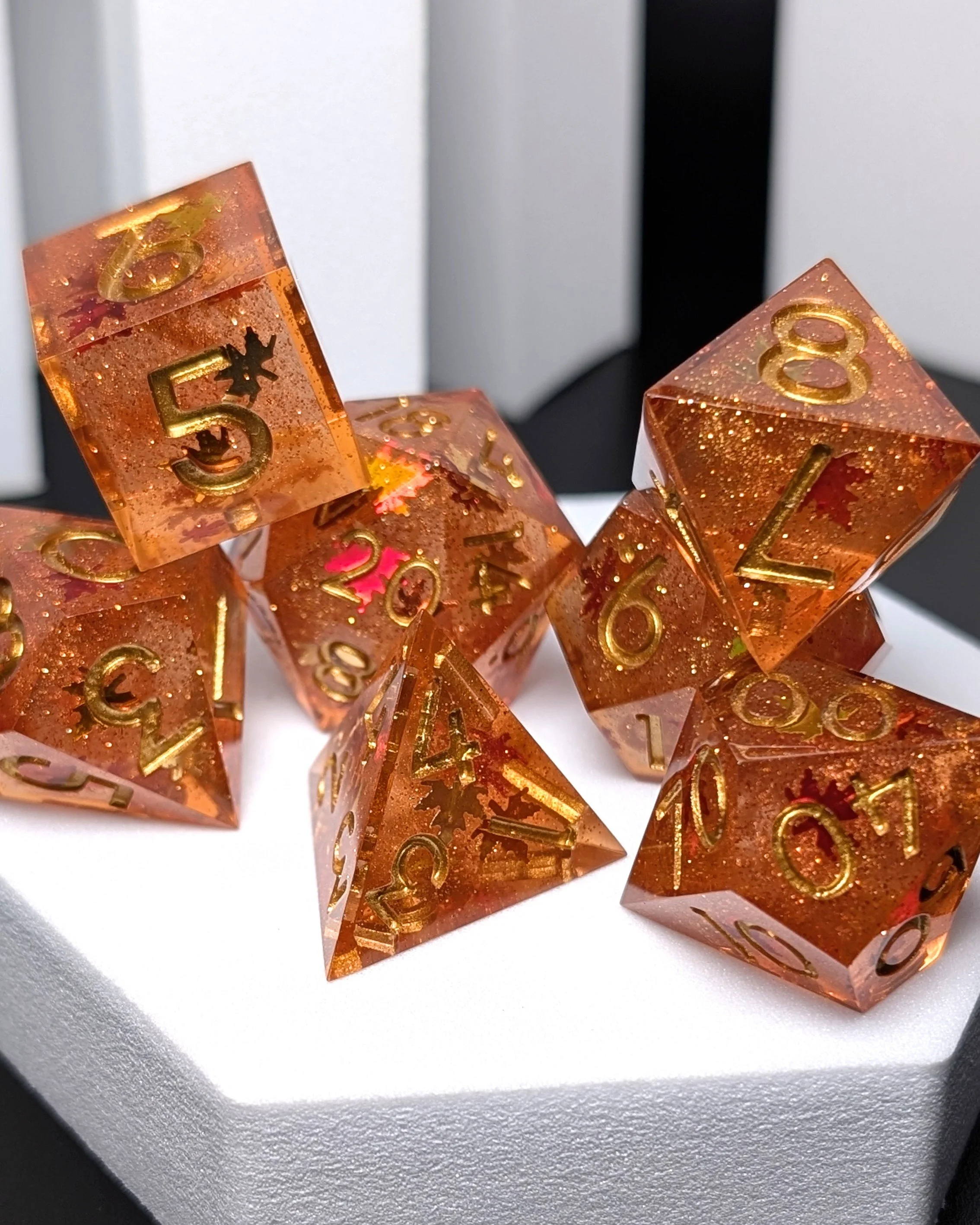 This is a 7-piece set of sharp-edged polyhedral dice, consisting of a d4, d6, d8, d10, d%, d12, and d20. Includes fine copper and gold glitter, as well as larger glitter shaped like maple leaves, within translucent orange resin. Inked in gold.