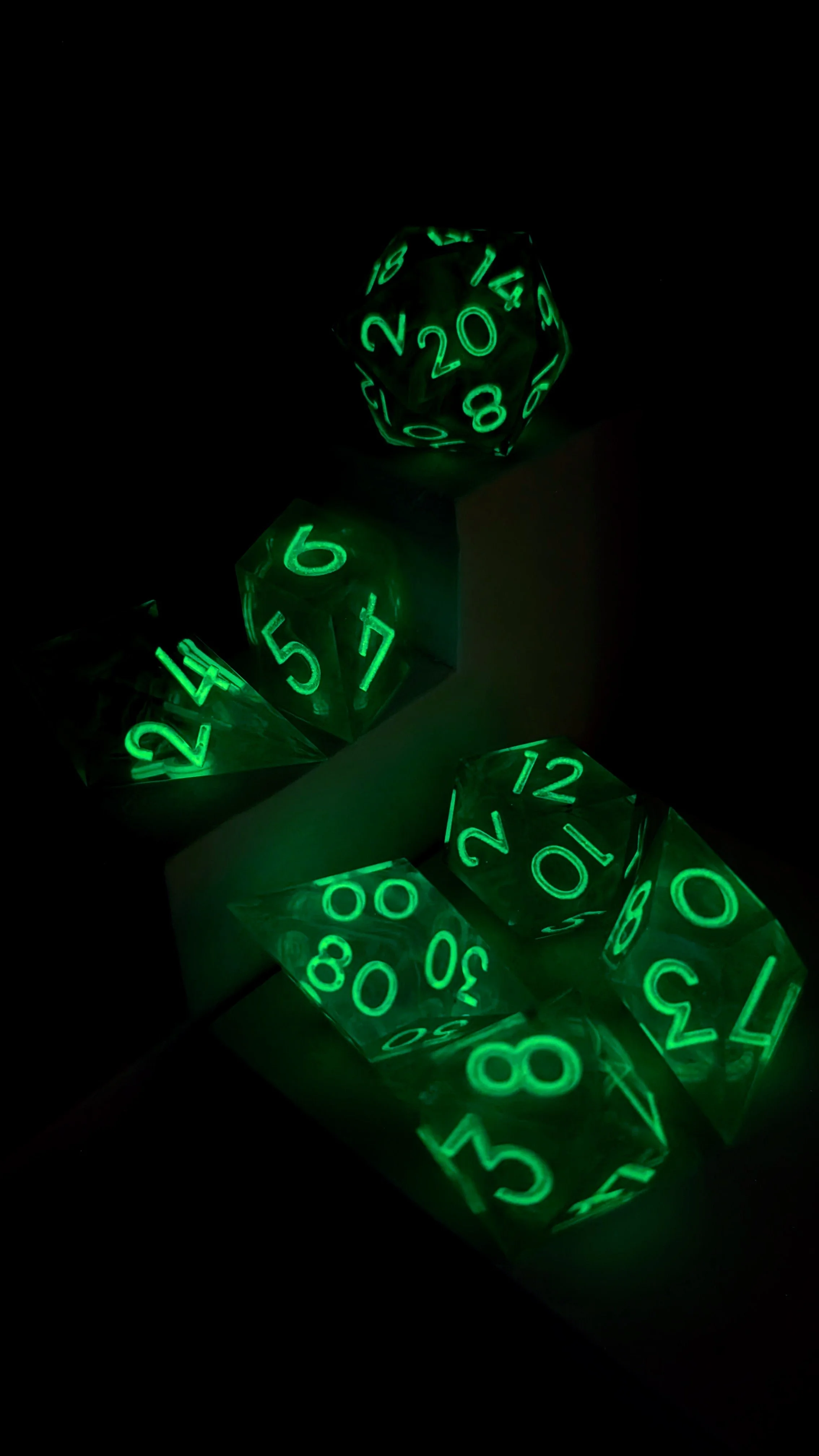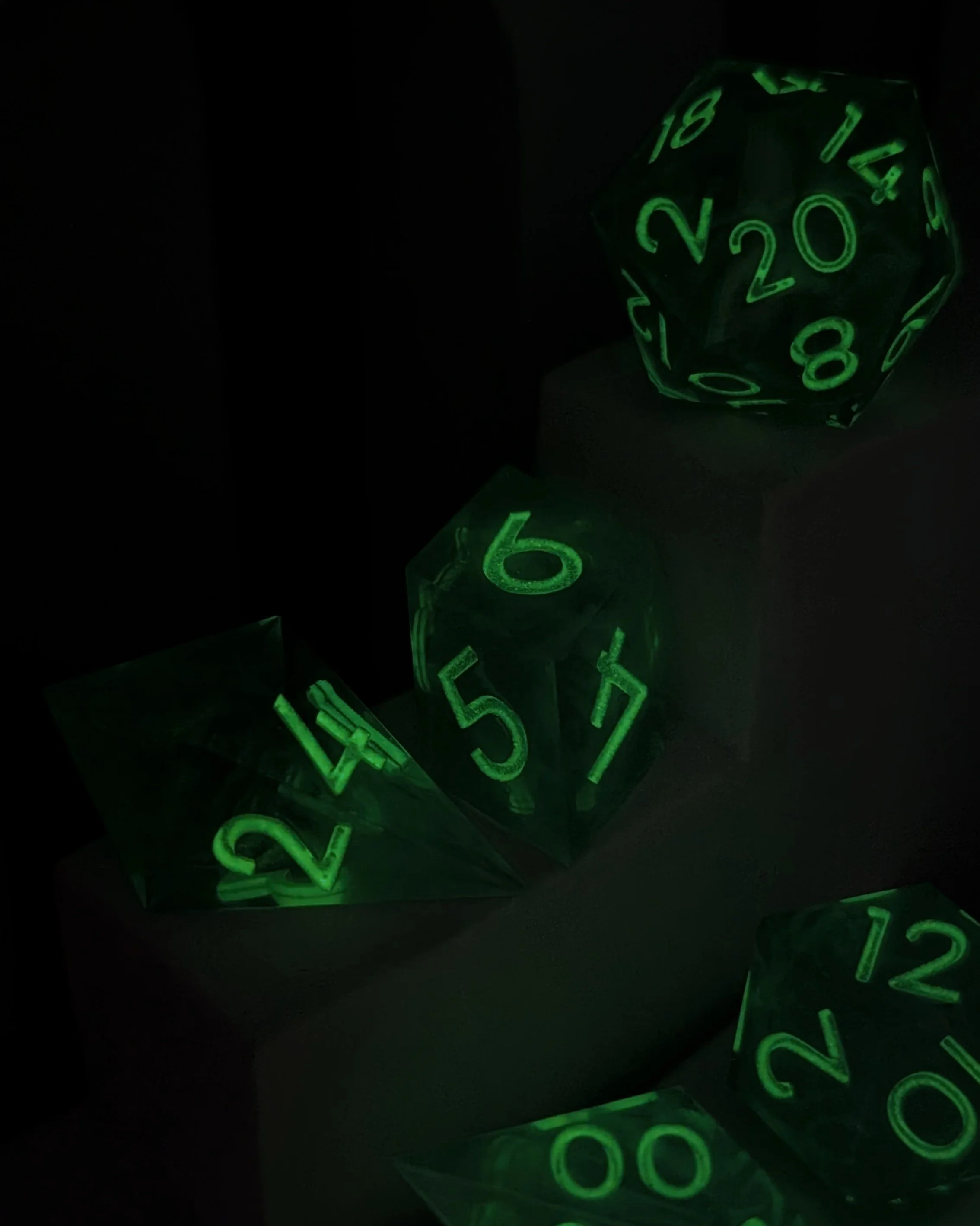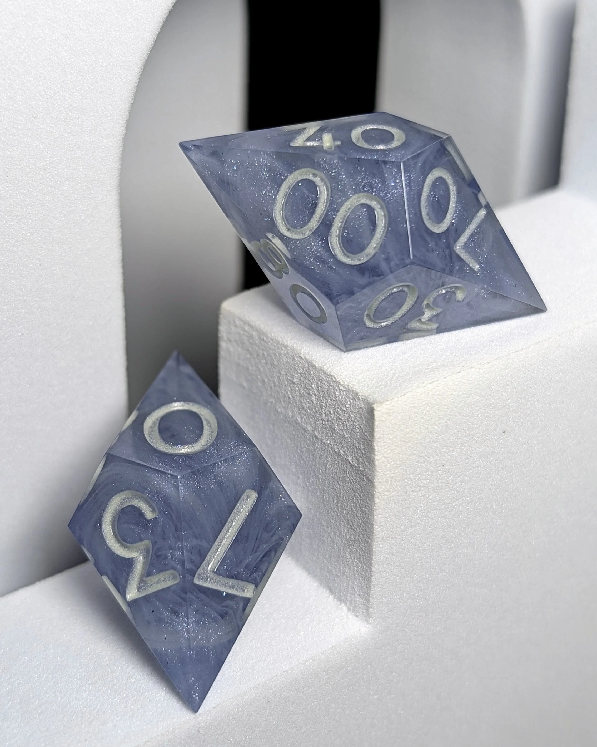 This is a 7-piece set of sharp-edged polyhedral dice in our alternate shapes, consisting of a d4, d6, d8, d10, d%, d12, and d20. Includes swirls of soft white suspended within translucent gray blue resin. Inked in a UV reactive white, which glows green in the dark.