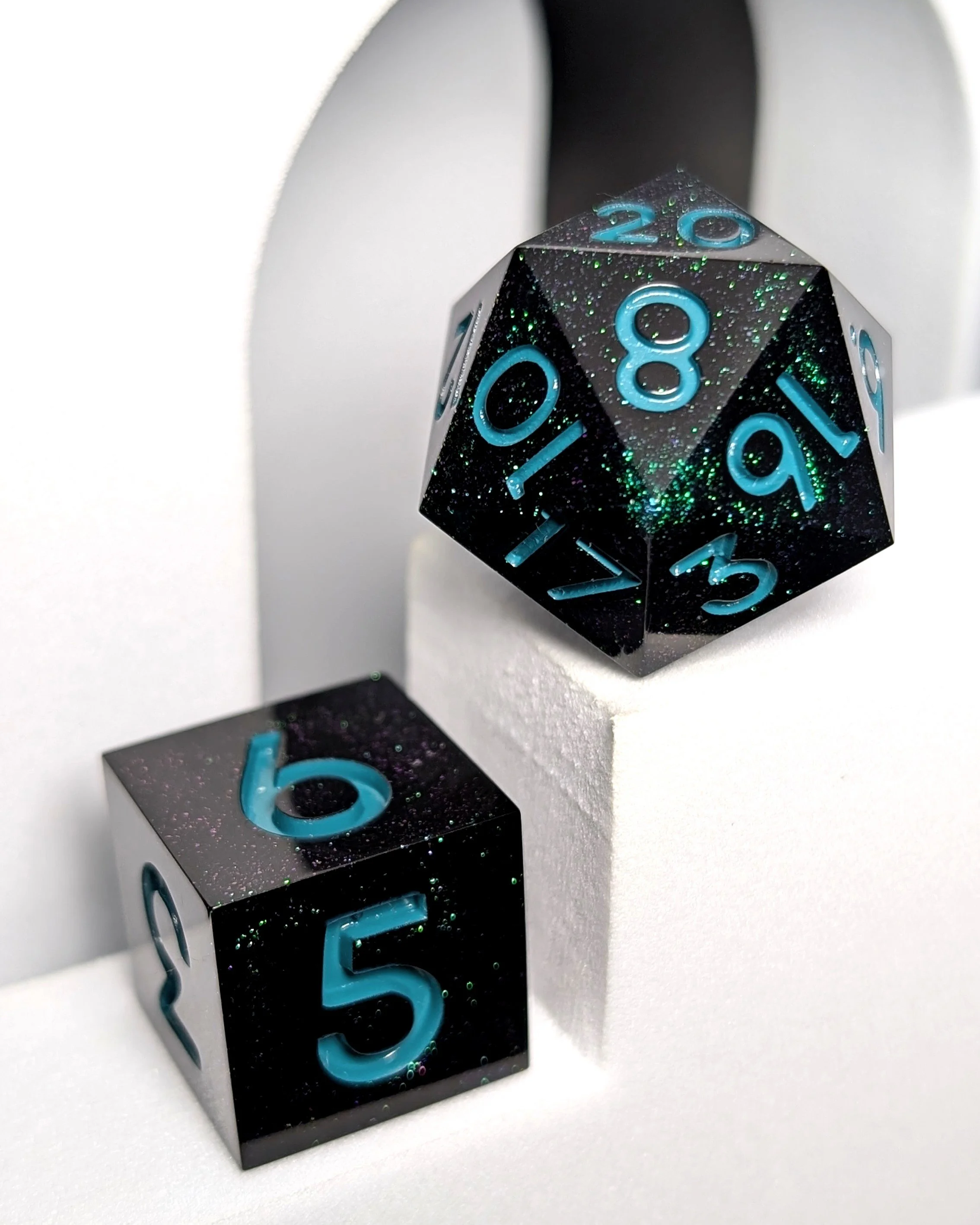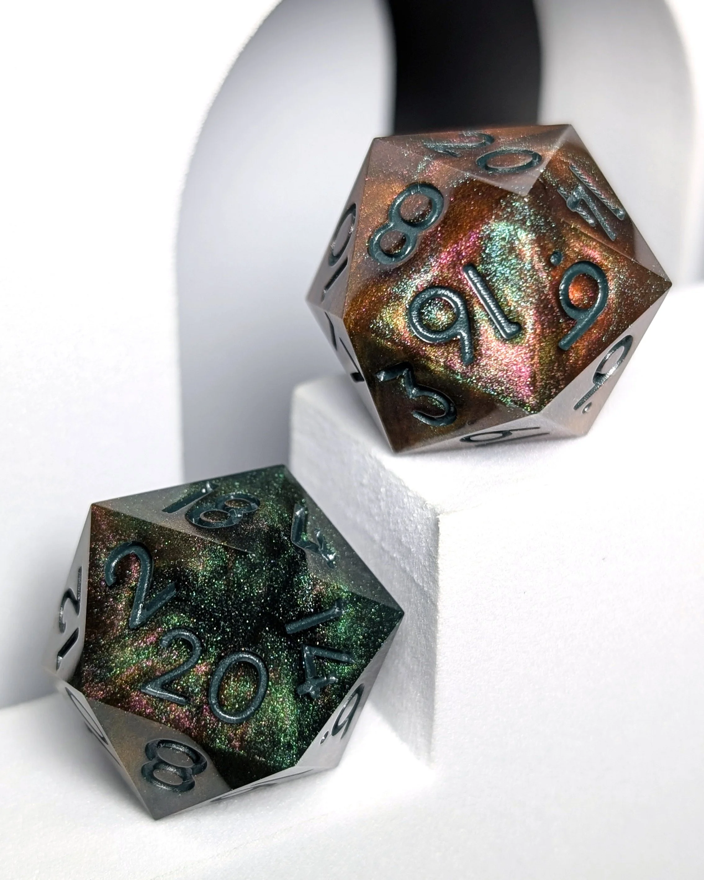 Disclaimer: As all of our dice are handmade from start to finish, they may include small flaws or blemishes, any of which will be visible in the listing photos. No dice are perfectly balanced, but we do our best to produce the most even balance we can. All the same, make sure to ask your DM before you play with handmade dice.